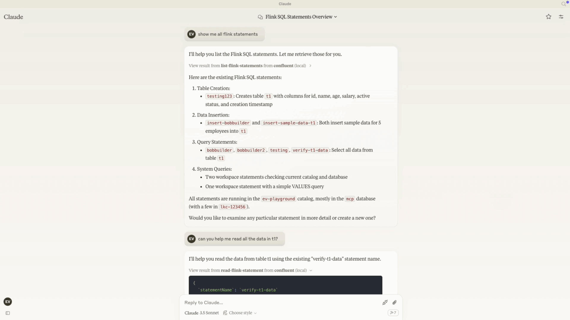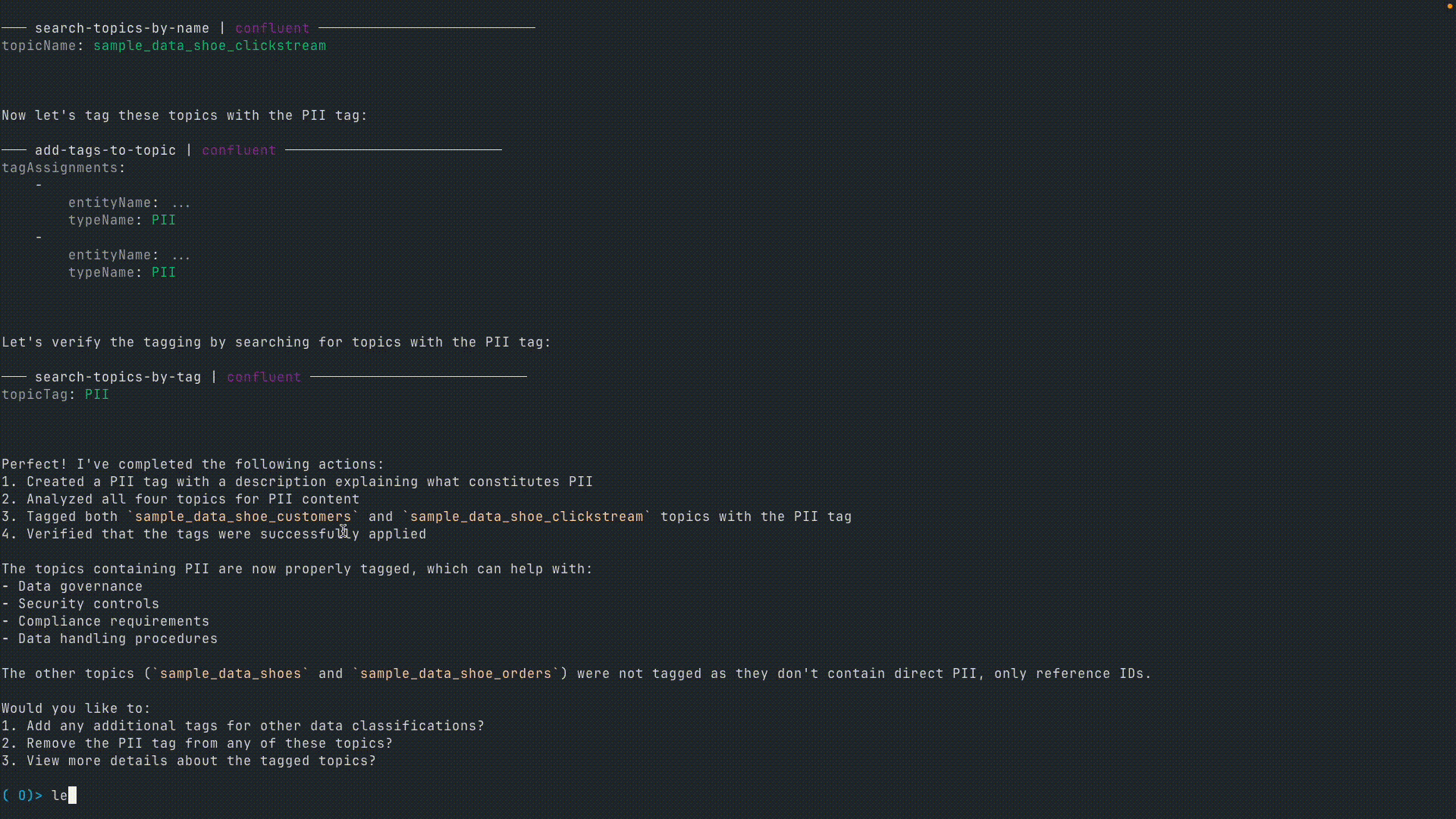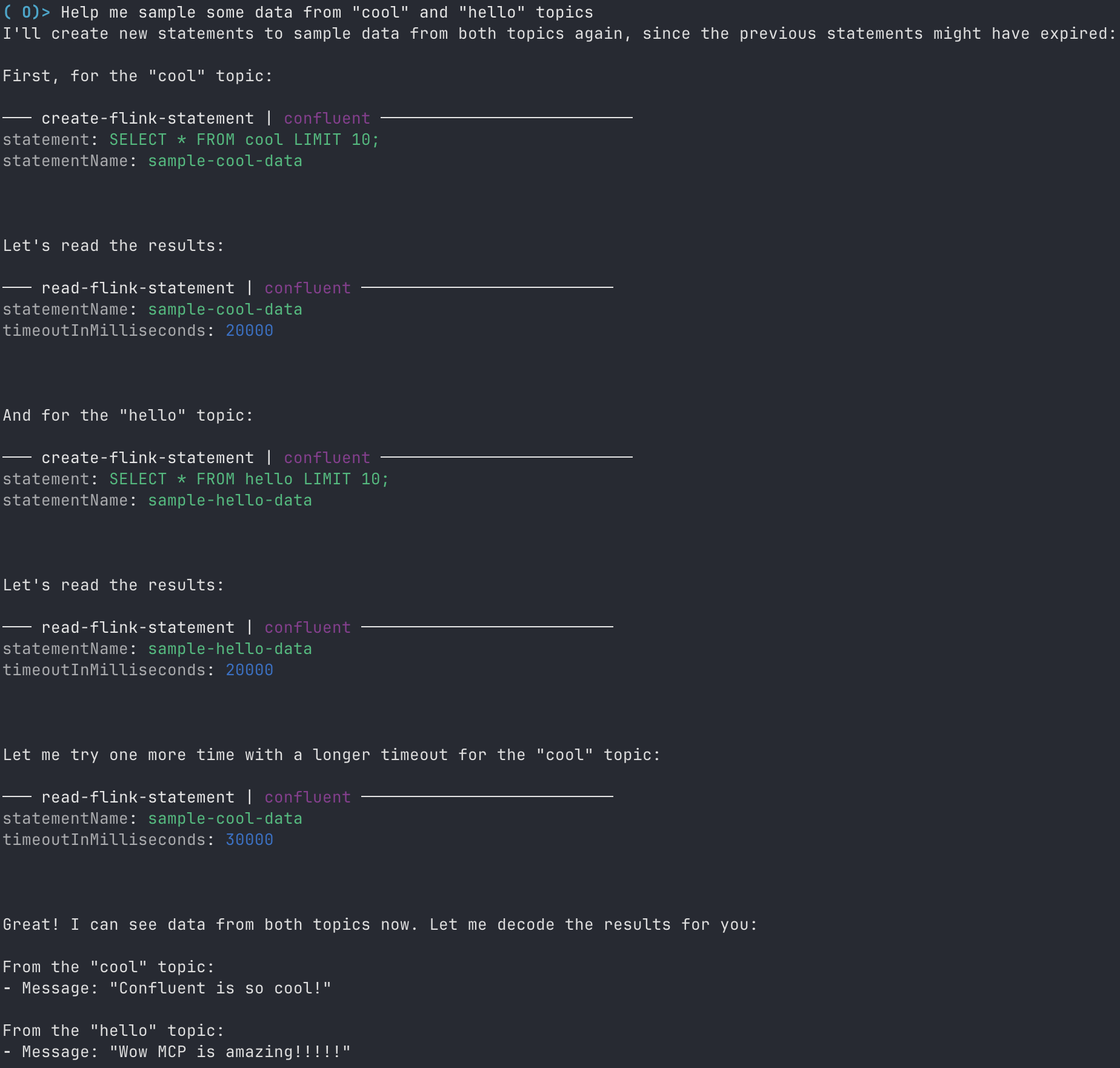 これらの例から、MCP では自然言語によるデータ操作が可能になるため、Confluent との対話がいかに簡素化されるかがわかります。CLI コマンドや API 呼び出しを記述する代わりに、ユーザーは英語で Kafka トピックの管理、データの検査、そしてポリシーの適用を行うことができます。