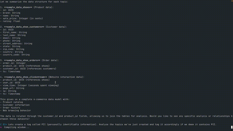 ユーザー : 「Let’s create a tag called PII (personally identifiable information). Analyze the topics we’ve just created and tag them accordingly if they contain PII. (““PII (個人識別情報)” というタグを作って。さっき作ったトピックを分析して、PII が含まれていればそのタグを付けて)」