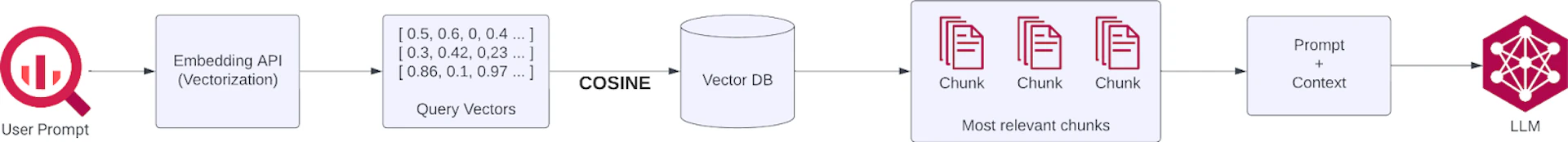 ドキュメントがベクトル データベースにインジェスト(取り込み)されたら、次にユーザーからの クエリを処理します。このステップでは、ユーザー プロンプトに応じて最も関連性の高いチャンクを取得し、LLM リクエストに注入します。