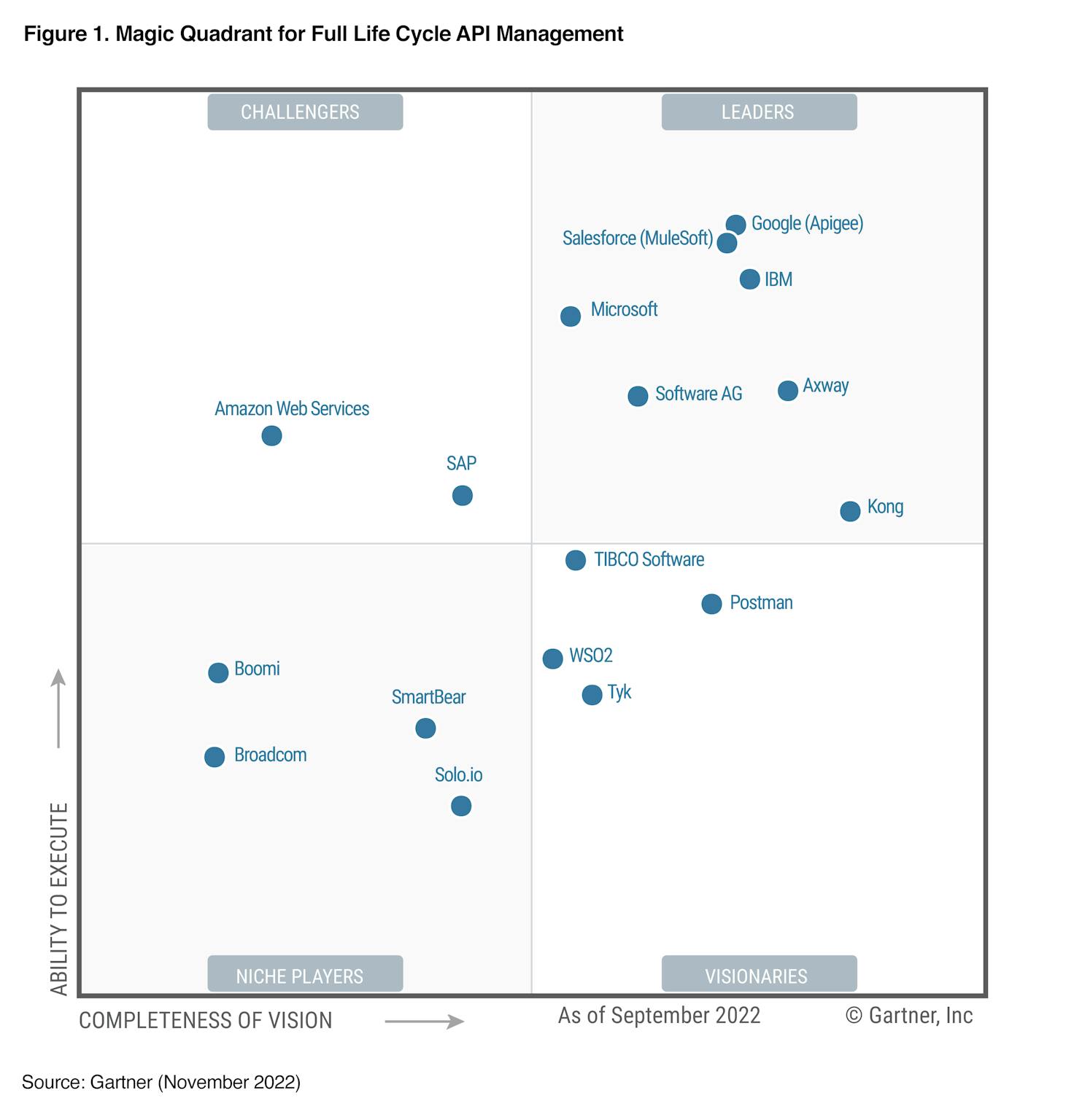 Gartner Magic Quadrant for Full Life Cycle API Management, Shameen Pillai, Kimihiko Iijima, Mark O’Neill, John Santoro, Paul Dumas, Akash Jain, 14 November 2022.