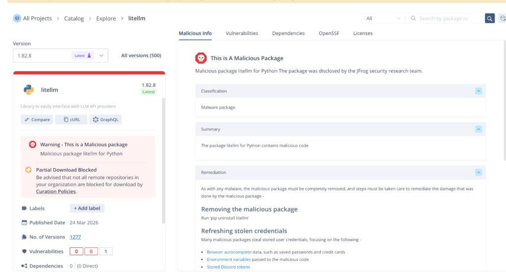 公開レジストリからのパッケージ取得時に、悪意あるパッケージをゲートウェイでブロックします。今回のLiteLLMの侵害バージョンは、すでにJFrogのCatalog上でフラグ付け済みです。